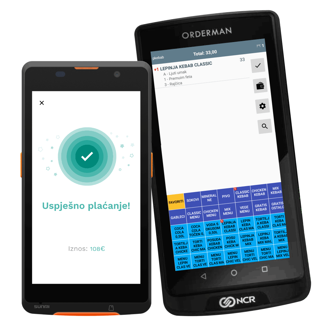 A novelty in our range of handheld terminals are terminals that combine the functionality of mobile ordering with processing of card payments. They are available on the Sunmi hardware or the Orderman 9 models of handheld terminals.